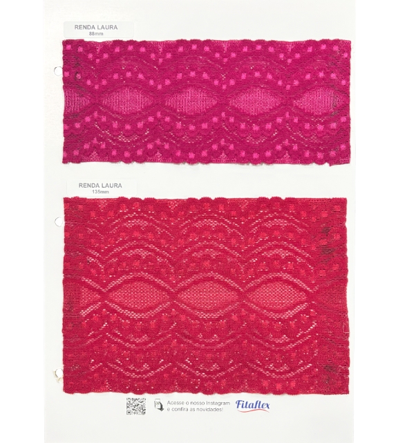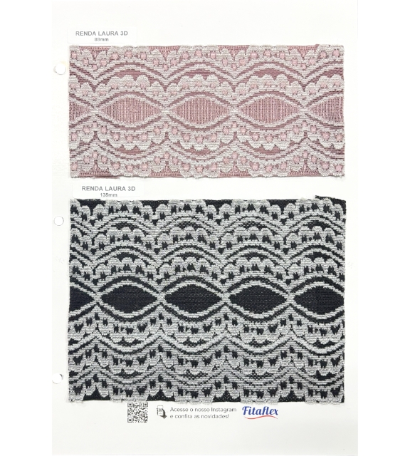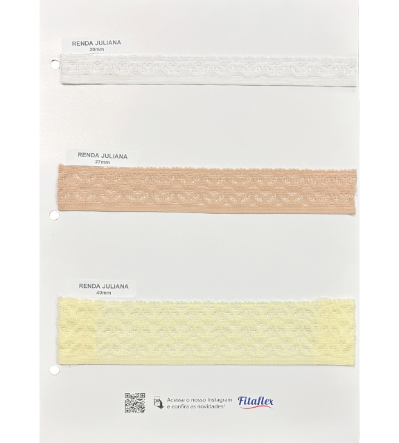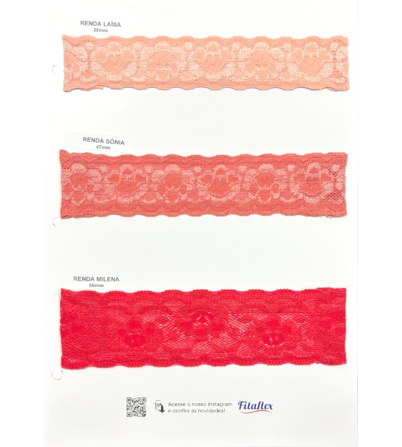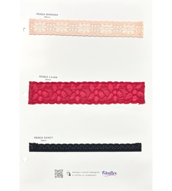 🔹 Renda Lilian: Com 36mm de largura, a nova renda Fitaflex exibe um elegante design floral, combinando tradição e modernidade. Sua elasticidade proporciona versatilidade, tornando-a ideal para composições sofisticadas na moda íntima e no Sleepwear.